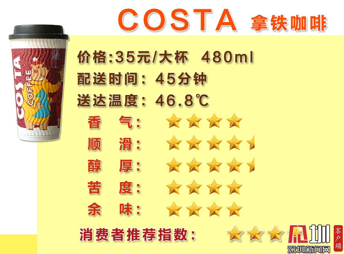 時(shí)間及溫度方面,因各品牌咖啡配送距離不一致,該兩項(xiàng)數(shù)據(jù)僅做參考使用。(配送時(shí)間段:13:30-15:30)在外賣到達(dá)時(shí)第一時(shí)間測(cè)量溫度并記錄配送時(shí)間,具體數(shù)據(jù)如下:星巴克咖啡配送時(shí)間為17分鐘,送達(dá)溫度為58.5℃;瑞幸用時(shí)29分鐘,送達(dá)溫度為54.4℃;Costa咖啡用時(shí)45分鐘送,達(dá)溫度為46.8℃;太平洋咖啡用時(shí)45分鐘,送達(dá)溫度為54.5℃。