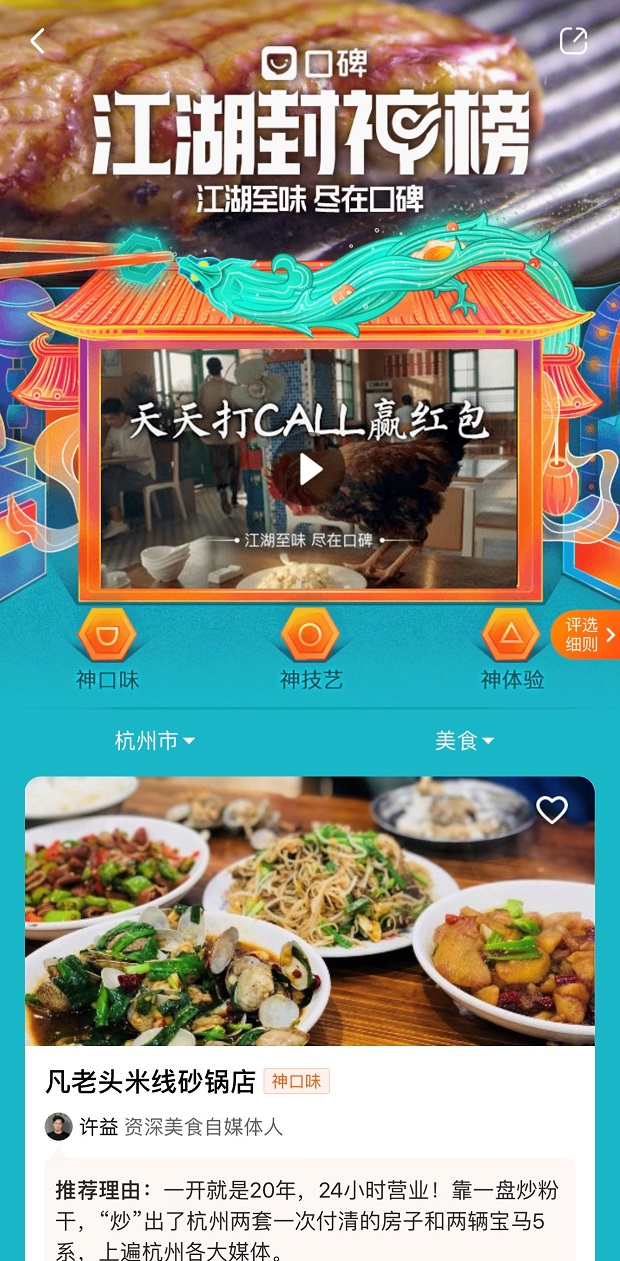 今年“雙12”,口碑餓了么首次發(fā)布“江湖封神榜”,入圍店鋪先由美食體驗者、觀察家、媒體團(tuán)在內(nèi)的本地評審團(tuán)先提名,再經(jīng)過阿里本地生活大數(shù)據(jù)進(jìn)行智能評分,同時邀請眾多消費(fèi)者投票驗名“真身“。商戶上榜不靠流量,不用刷單,也不必?fù)?dān)心惡意差評影響流量和排名。消費(fèi)者就算沒有本地老餮帶路,參考“江湖封神榜”就能找到地道美食。目前,首批入選的1730家店鋪,分布在北京、杭州、成都、廣州等13座城市。消費(fèi)者通過口碑a(chǎn)pp上選擇相應(yīng)的城市坐標(biāo),點擊“江湖封神榜”,就可以找到推薦好店。