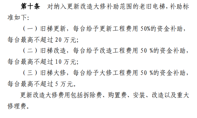 (三)舊梯大修,每臺(tái)給予大修工程費(fèi)用50 %的資金補(bǔ)助,每臺(tái)最高不超過(guò)5萬(wàn)元。