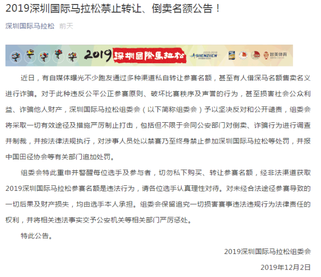 12月2日,深馬組委會(huì)發(fā)布公告,對于此種違反公平公正參賽原則、破壞比賽秩序及聲譽(yù)的行為,甚至損害社會(huì)公眾利益、詐騙他人財(cái)產(chǎn),深圳國際馬拉松組委會(huì)(以下簡稱組委會(huì))予以堅(jiān)決反對和公開譴責(zé)。