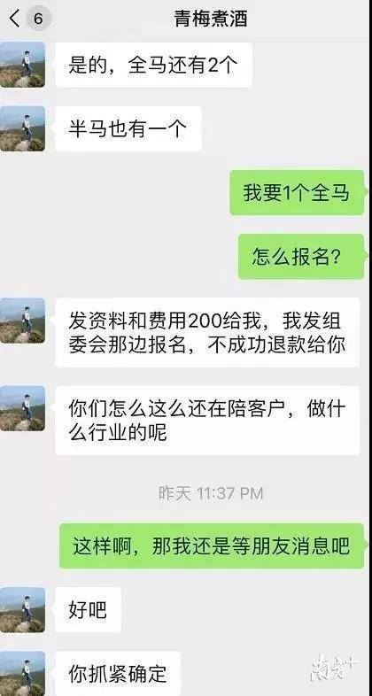 11月28日,一個(gè)網(wǎng)名為“青梅煮酒”的跑友在多個(gè)跑友群中發(fā)布了關(guān)于出售“深馬”參賽名額的消息。多名跑友私信聯(lián)系轉(zhuǎn)賬,沒(méi)想到付款后卻立即被拉黑。《深馬開(kāi)跑在即,花兩百元可買(mǎi)名額?多名跑友微信轉(zhuǎn)賬被騙》