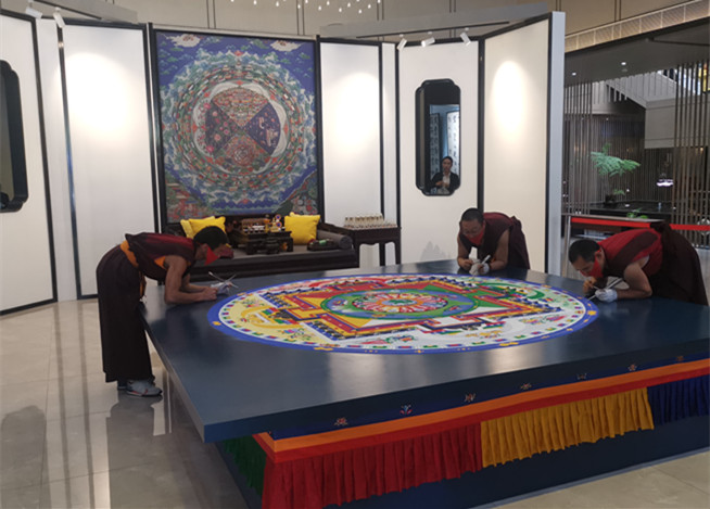 在活動(dòng)現(xiàn)場(chǎng),壇城沙畫(huà)的現(xiàn)場(chǎng)制作格外引人注目?!耙簧骋皇澜?,一葉一菩提”——壇城沙畫(huà)的過(guò)程仿佛一場(chǎng)視覺(jué)的盛宴。據(jù)了解,壇城是指對(duì)一座宮殿一個(gè)世界的泛義,用珍貴珊瑚、瑪瑙、綠松石等礦物質(zhì)研磨成粉,落沙即成畫(huà),畫(huà)面立體生動(dòng),壇城展示了高度的藝術(shù)魅力和視覺(jué)觀(guān)感。
