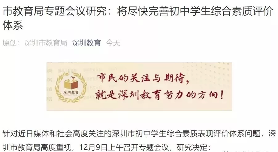 針對近日社會高度關注的深圳市初中學生綜合素質表現評價體系問題,深圳市教育局于今天上午召開專題會議,并作出最新回應:將盡快完善初中學生綜合素質評價體系。