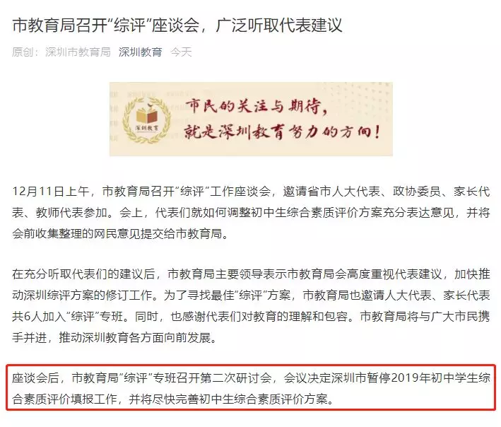 座談會后,市教育局“綜評”專班召開第二次研討會,會議決定深圳市暫停2019年初中學(xué)生綜合素質(zhì)評價(jià)填報(bào)工作,并將盡快完善初中生綜合素質(zhì)評價(jià)方案。