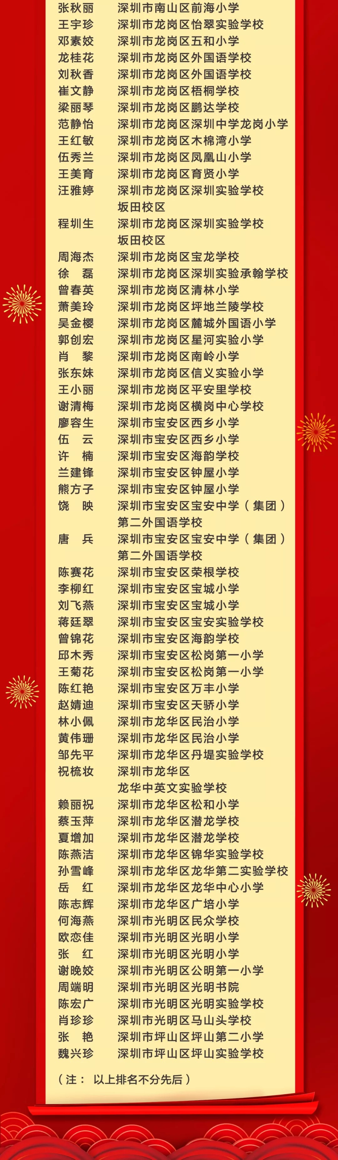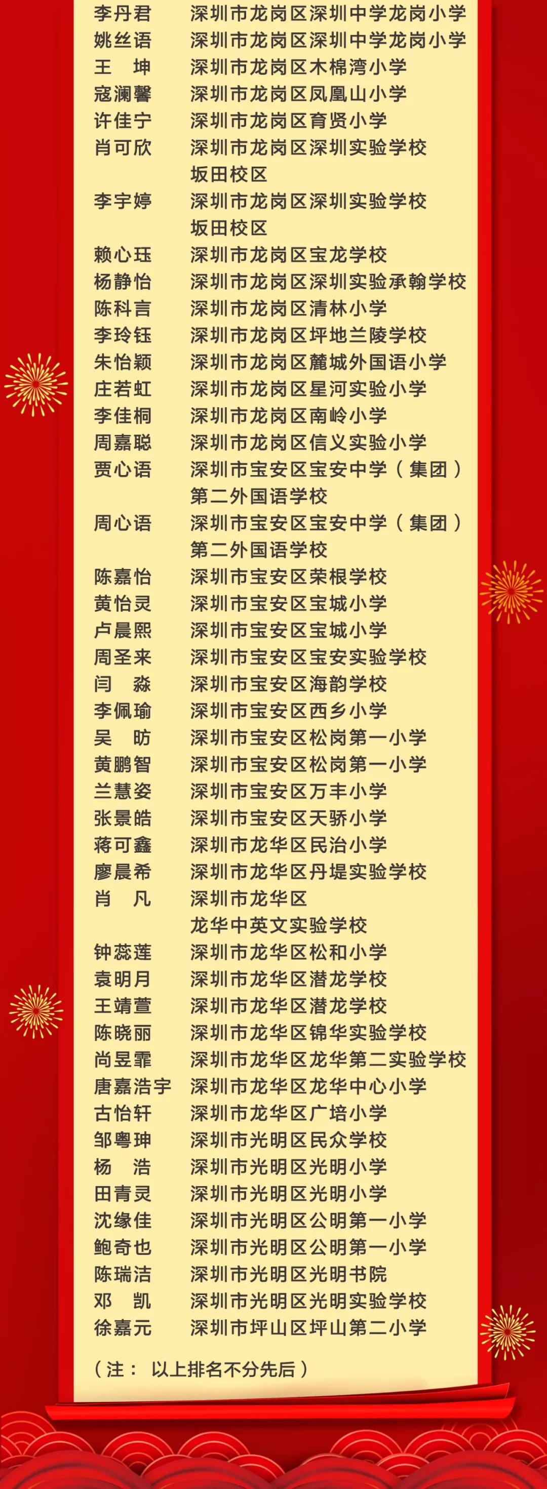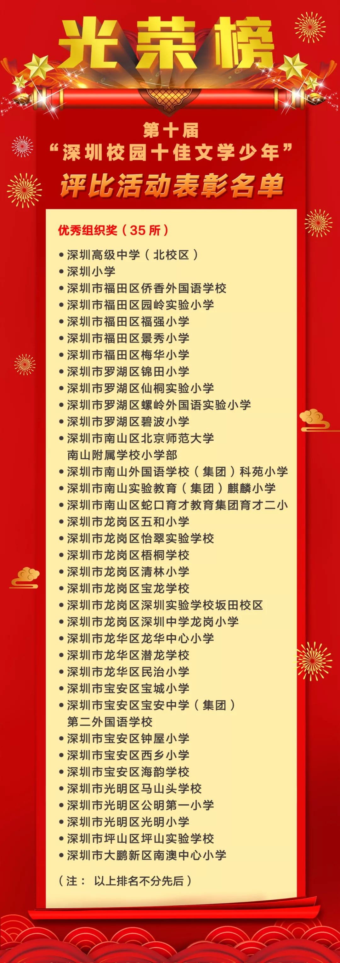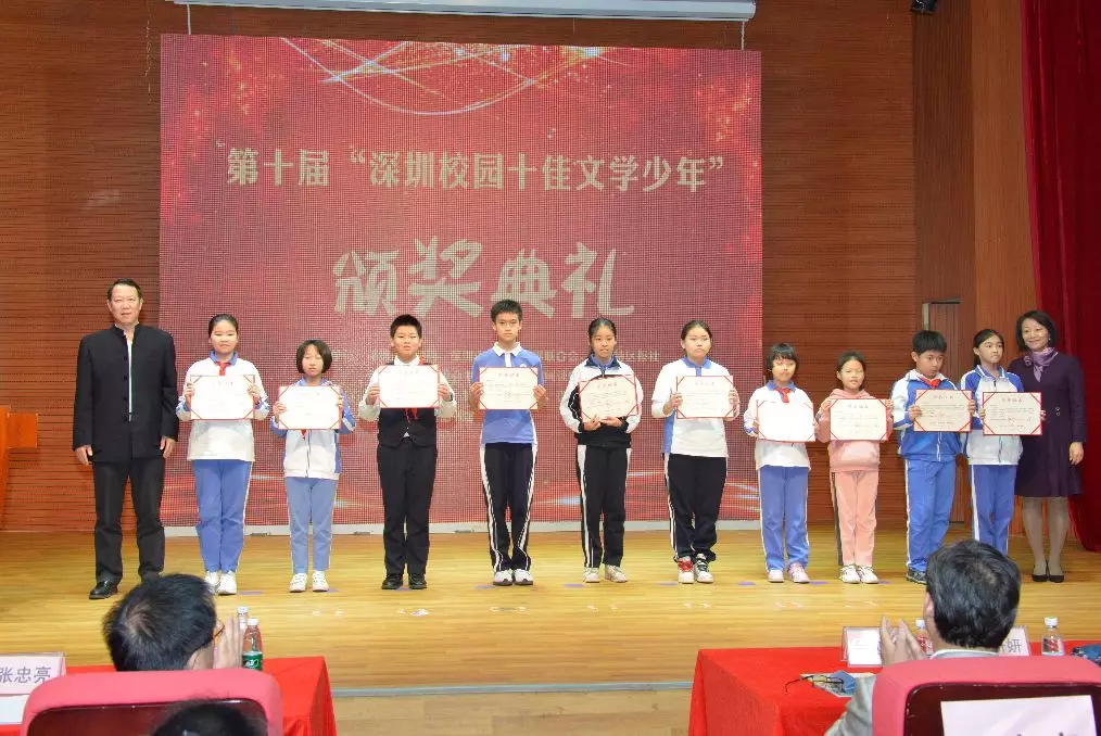 活動還揭曉了“十佳文學少年提名獎”“優(yōu)秀文學少年”“優(yōu)秀輔導老師獎”和“優(yōu)秀組織獎”的獲獎個人及學校。深圳市羅湖區(qū)錦田小學陳彥竹等10名學生獲評“十佳文學少年提名獎”,深圳小學劉子媛等80名學生獲評“優(yōu)秀文學少年”,深圳市福田區(qū)僑香外國語學校吳書華等89名教師榮獲“優(yōu)秀輔導老師獎”,深圳高級中學(北校區(qū))等35所學校獲得“優(yōu)秀組織獎”。
