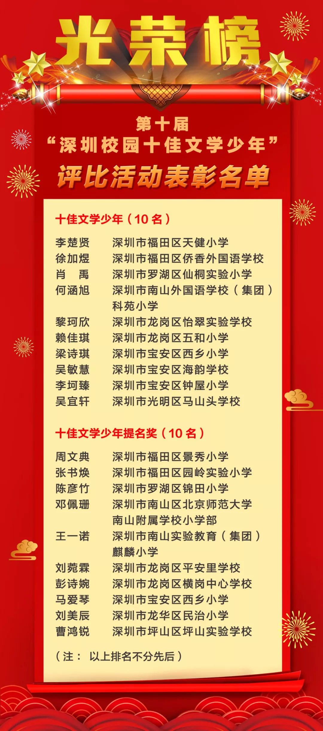 第十屆“深圳校園十佳文學少年”評比活動表彰名單