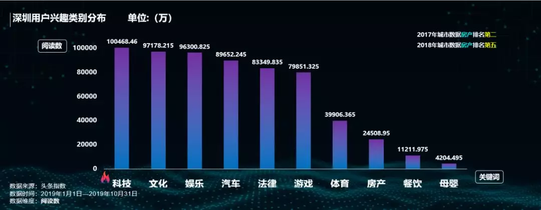 今年深圳網(wǎng)友對科技最感興趣,文化次之。房產(chǎn)排名連續(xù)兩年下滑,2017年排名第二,2018年跌至第五,而今年降至第八。