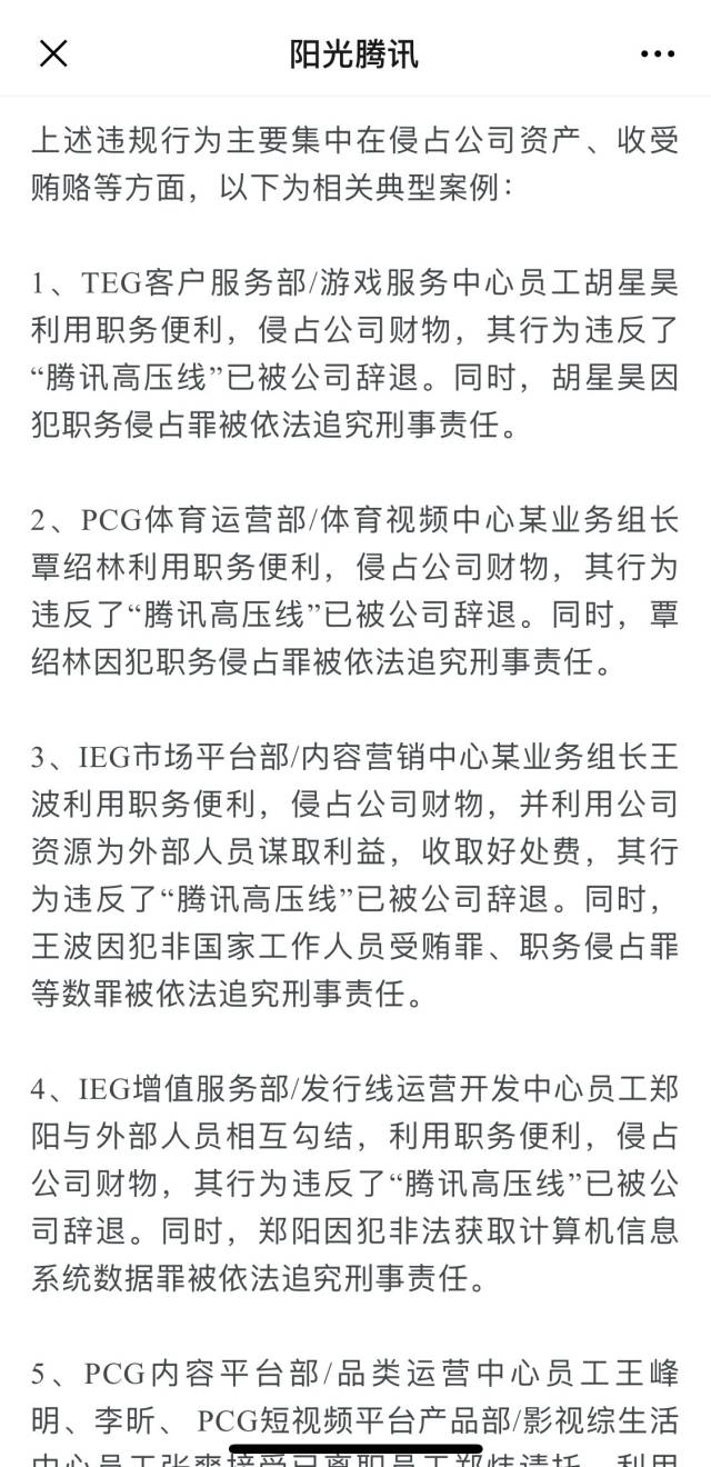 2、PCG體育運營部/體育視頻中心某業(yè)務(wù)組長覃紹林利用職務(wù)便利,侵占公司財物,其行為違反了“騰訊高壓線”已被公司辭退。同時,覃紹林因犯職務(wù)侵占罪被依法追究刑事責(zé)任。