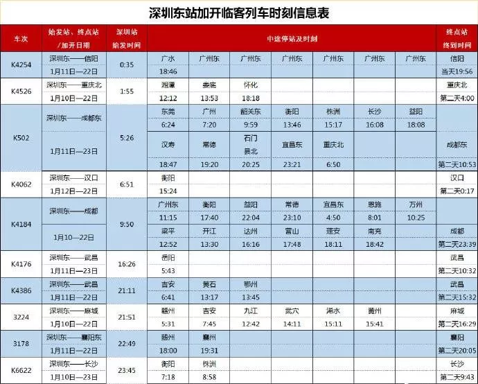 為了迎接春運(yùn),深圳火車站調(diào)整了列車開行,將加開多趟臨客。目前,深圳往返肇慶的C7090/89次跨線動(dòng)車組列車暫未開行,深圳東往返懷化的K9052/1次列車已經(jīng)停運(yùn)。今天(1月8日)起,深圳往返河源的Z8006/5次將停運(yùn)。春運(yùn)期間,深圳往返梅州的T8370/69次列車將改為在深圳至大埔間開行。