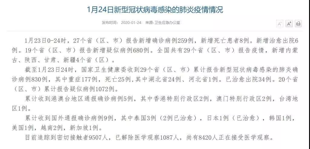 國(guó)家衛(wèi)建委通報(bào):1月23日0-24時(shí),27個(gè)?。▍^(qū)、市)報(bào)告新增確診病例259例,新增死亡患者8例。新增治愈出院6例。19個(gè)省(區(qū)、市)報(bào)告新增疑似病例680例。全國(guó)共有29個(gè)?。▍^(qū)、市)報(bào)告疫情,新增內(nèi)蒙古、陜西、甘肅、新疆4個(gè)?。▍^(qū))。