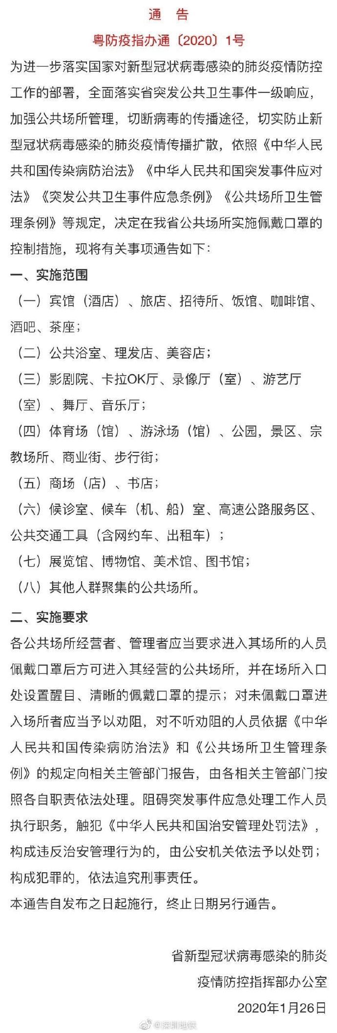 見圳客戶端·深圳新聞網2020年1月27日訊 深圳地鐵官方微博1月26日發(fā)布運營公告:根據粵防疫指辦發(fā)布的〔2020〕1號通告的相關要求,為全面落實省突發(fā)公共衛(wèi)生事件一級響應,加強地鐵公共場所管理,切斷病毒的傳播途徑,即日起,凡進入地鐵車范圍內必須全程佩戴口罩,未佩戴口罩進入者將被勸阻離開。對不聽勸阻且情節(jié)嚴重者,將依法移交公安機關進一步處置。