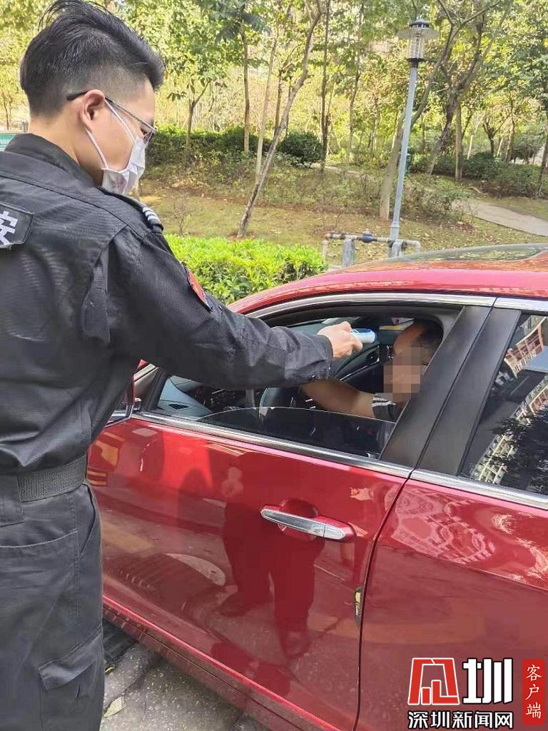 保安對(duì)進(jìn)出小區(qū)車主進(jìn)行體溫測量。