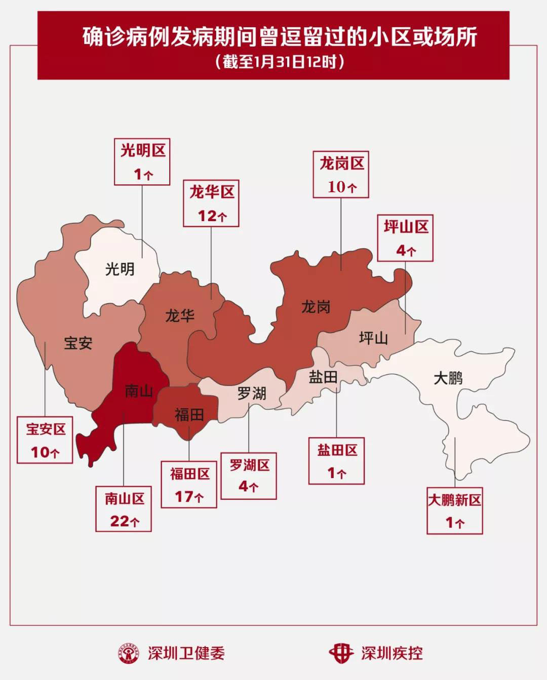 截至1月31日12時(shí),深圳累計(jì)確診的134個(gè)“新型肺炎”患者,曾在出現(xiàn)病征期間逗留過以下82個(gè)場所,其中有部分地方同時(shí)出現(xiàn)了多個(gè)病人(主要是一個(gè)家庭內(nèi)有多人發(fā)?。?。
