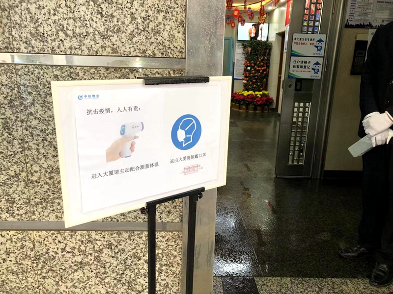 實地探訪小區(qū)防疫工作:有兩名值班保安在門口嚴(yán)格把關(guān),對每個進入小區(qū)的住戶進行體溫檢測。一輛灑水車正在圍繞小區(qū)噴灑消毒液。