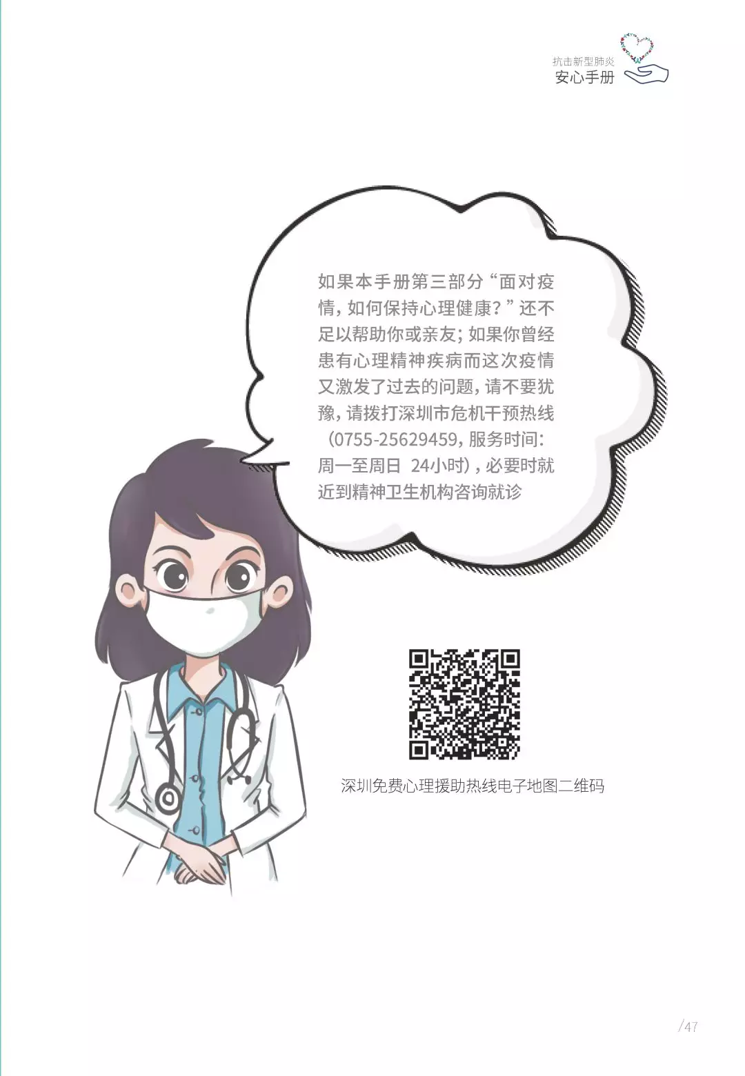 抗擊新型肺炎“安心手冊”由深圳市精神衛(wèi)生中心/深圳市康寧醫(yī)院支持,深圳市康寧醫(yī)院始建于1980年,是深圳市唯一一家集預(yù)防、醫(yī)療、康復(fù)、科研、教學(xué)于一體的公立三甲精神病專科醫(yī)院。2010年以來,醫(yī)院連續(xù)九年名列復(fù)旦大學(xué)醫(yī)院管理研究所中國最佳??婆判邪窬駥?漆t(yī)院前十位;2017年榮膺第五屆全國文明單位;2019年精神科獲評廣東省高水平臨床重點(diǎn)專科。醫(yī)院服務(wù)在各類顧客體驗(yàn)度和公眾滿意度測評中,名列前茅。