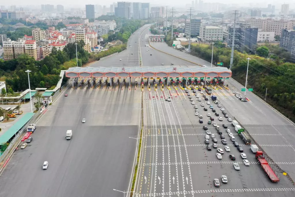 梅觀高速觀瀾收費(fèi)站,入深方向的車(chē)輛排隊(duì)依次接受檢查。