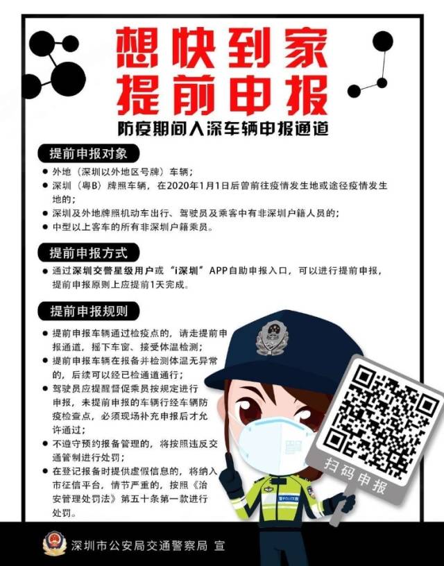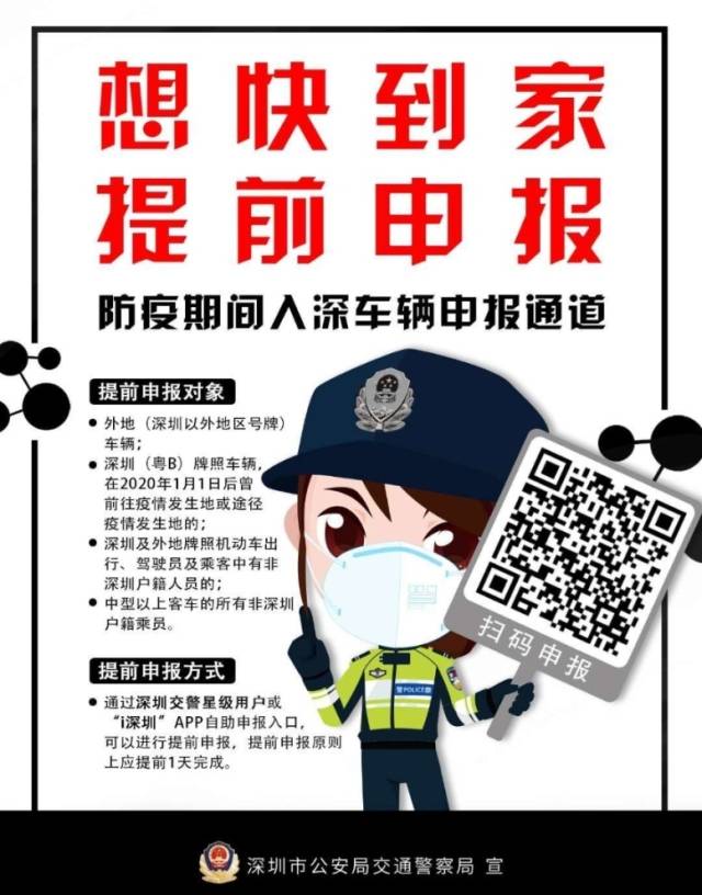 深圳交警提示,預(yù)計返深車流將逐漸增大,為了更快速的通過檢疫點,建議即將返深的車主和廣大市民提前通過網(wǎng)上進(jìn)行申報。