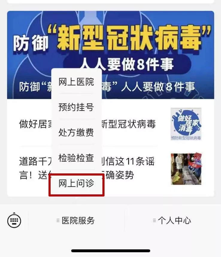 ①關(guān)注“深圳羅湖區(qū)人民醫(yī)院”的公眾號,點(diǎn)擊左下角菜單“醫(yī)院服務(wù)”→“網(wǎng)上問診”