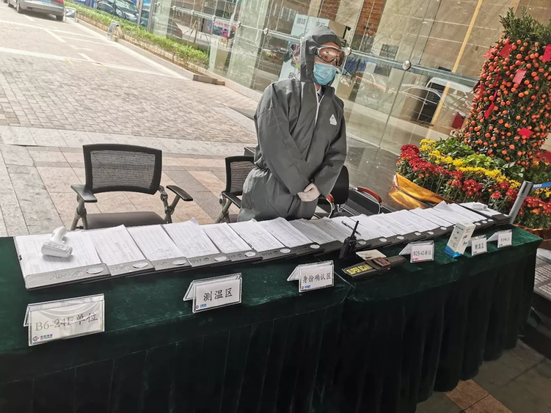 粵海街道的一棟寫字樓外設(shè)置的防控措施。新華社記者孫飛2月7日攝