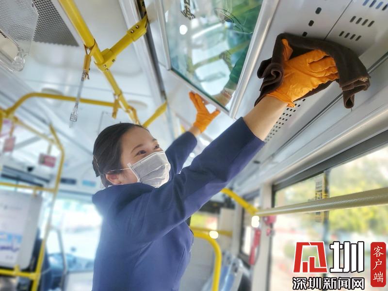 深圳巴士集團四分公司工作人員對公交車進行消毒擦洗。