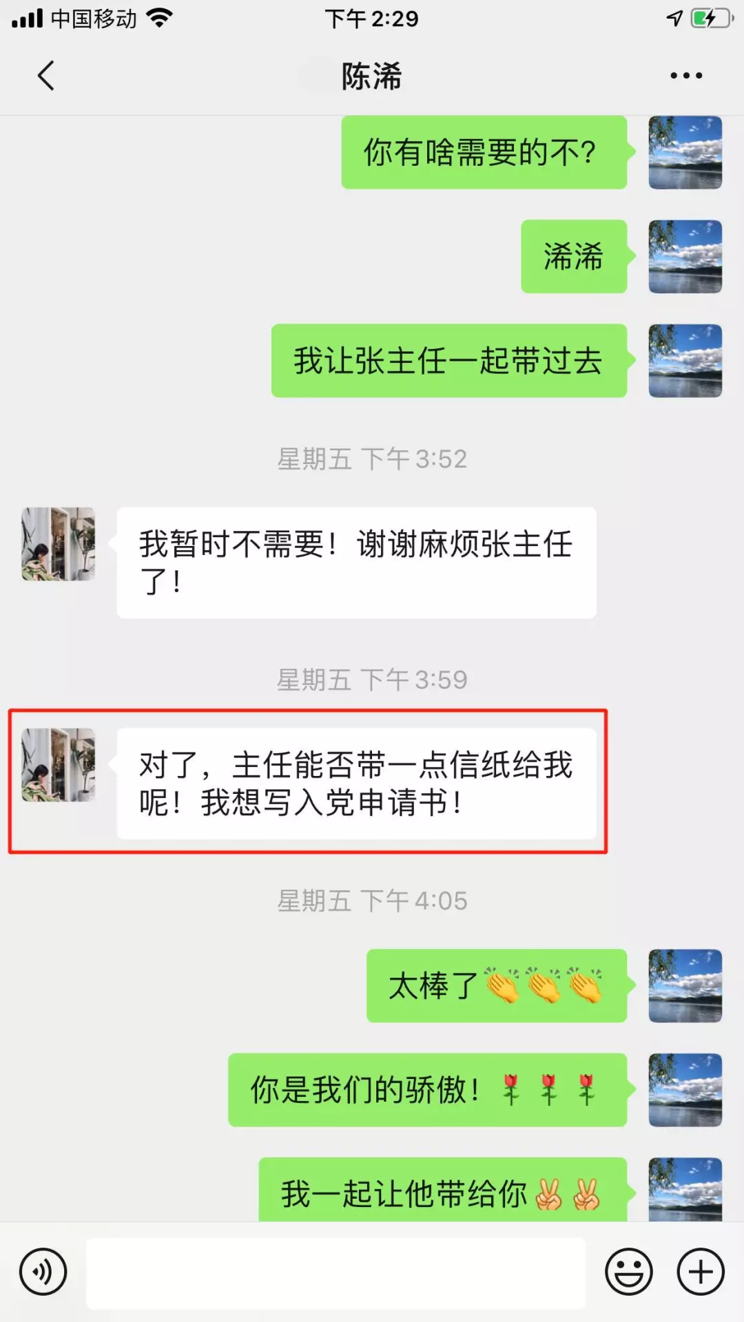 “主任能否帶一點信紙給我呢!我想寫入黨申請書!”陳浠在戰(zhàn)疫一線向組織發(fā)出了入黨申請!