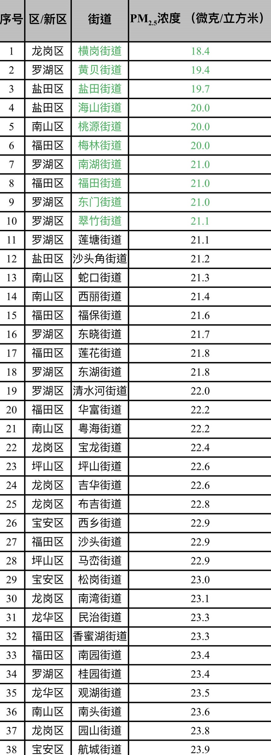 馬田、新安、觀瀾街道倒數(shù)!深圳1月份PM2.5濃度排行榜出爐