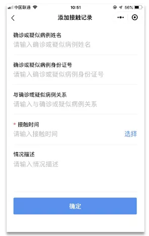 第三步:添加接觸記錄。若與確診或疑似病例有接觸過,需要添加接觸記錄,如有多次接觸記錄,可按實(shí)際填寫多條記錄。