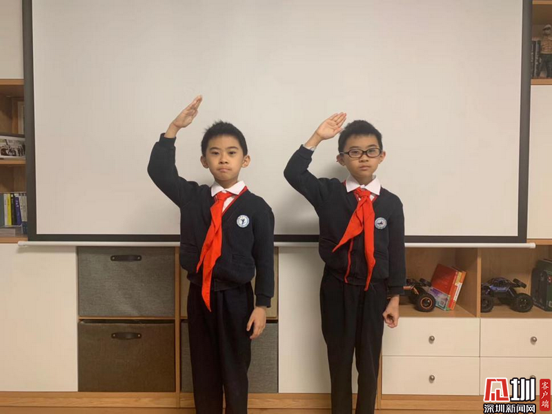 網(wǎng)上開(kāi)學(xué)第一天,雙胞胎學(xué)生穿好禮服、佩戴紅領(lǐng)巾,莊嚴(yán)地敬禮。