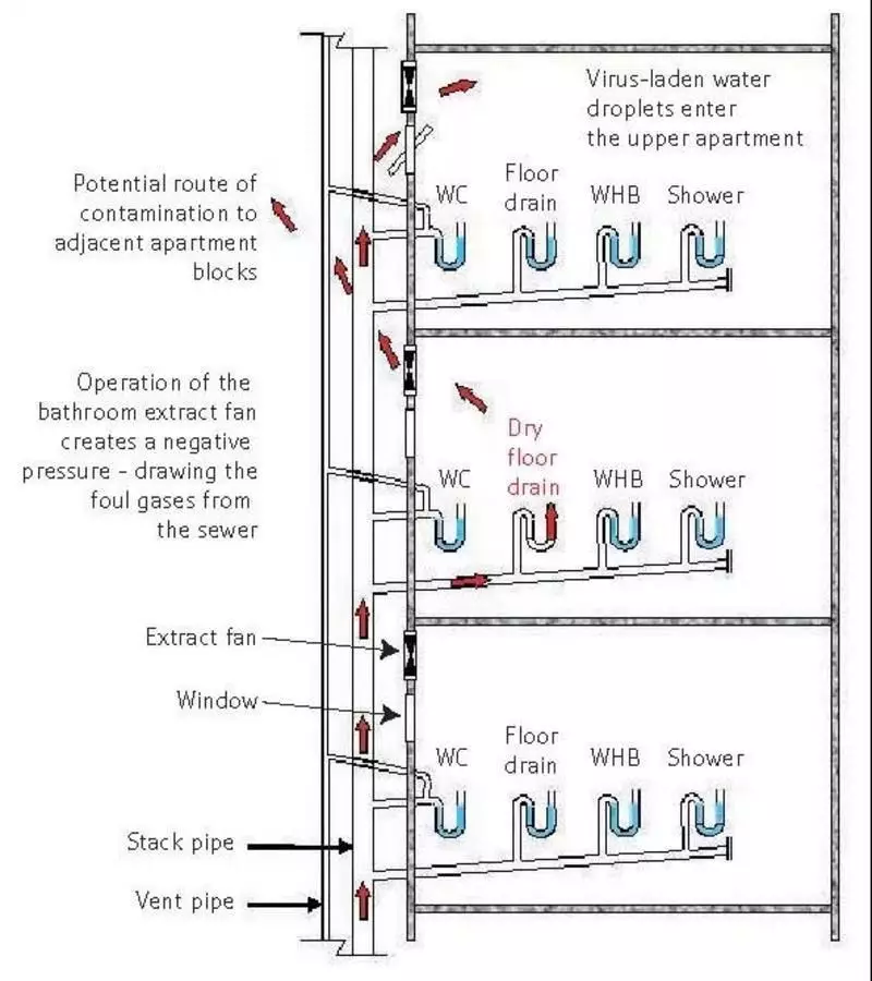 由于干涸的U型管內(nèi)存在帶病毒的污染物,而這些污染物處于暴露狀態(tài),可能通過地漏、甚至排風扇循環(huán)等其中的污染顆粒被人吸入導(dǎo)致感染。
