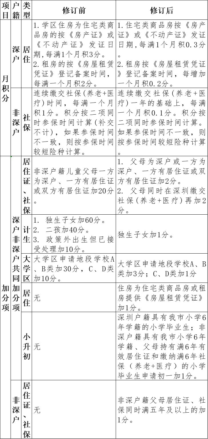 (3)非深圳戶籍兒童父母為深圳戶籍或雙方有居住證或一方有居住證另一方為深圳戶籍由原來加20分調(diào)整為2分;同時,加分對象由非深戶調(diào)整為所有申請兒童。