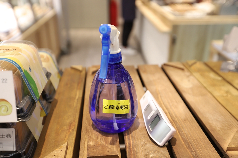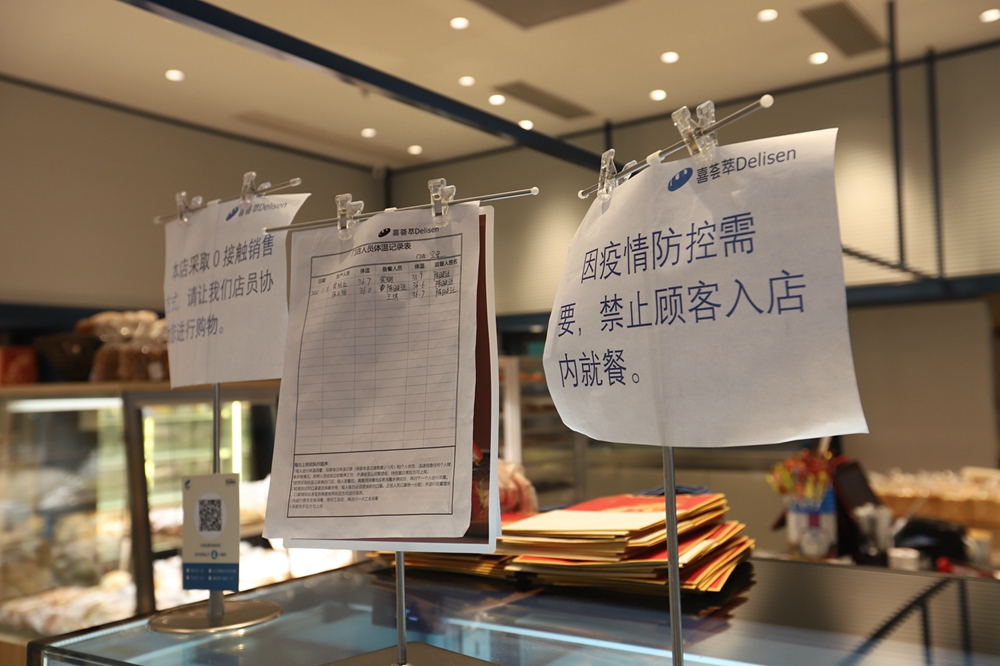 負(fù)二樓的喜薈萃是一家剛開業(yè)沒多久的面包店,記者看到里面燈光明亮、各式面包充盈貨賀,進店的通道已全部攔堵,并設(shè)置了取餐及消毒區(qū)。一名市民正在選購面包,他站在店外選好款式后,店員將面包打包好并放在取餐處,市民掃碼付款后就可以帶走了。這就是商場內(nèi)實行的“零接觸”購物。
