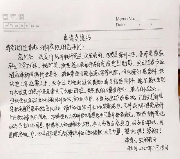 歐陽(yáng)莉麗同學(xué)申請(qǐng)支援感染科一線的申請(qǐng)書(shū)