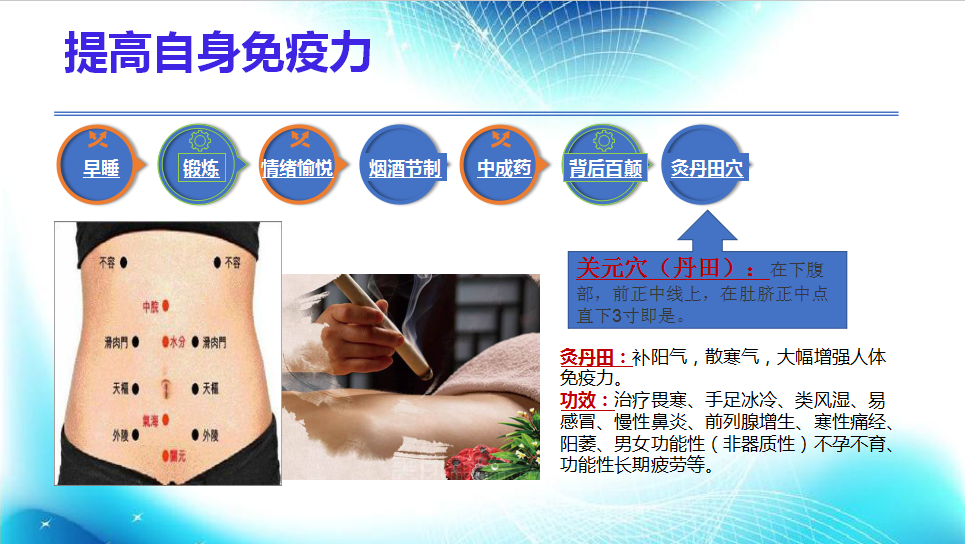 7.灸丹田穴:丹田在下腹部,前正中線上,在肚臍正中點直下3寸即是。灸丹田穴可以補(bǔ)陽氣,散寒氣,大幅增強(qiáng)人體免疫力。