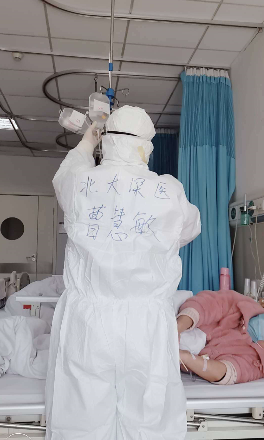 深圳醫(yī)療隊隊員曹慧敏在為患者服務(wù)。為了方便在“艙室”內(nèi)互相辨識,醫(yī)護人員都在自己的衣服上用記號筆寫上了名字。