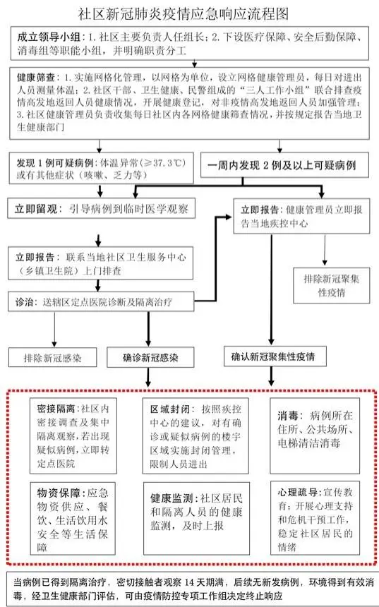 一、成立疫情應(yīng)急領(lǐng)導(dǎo)小組,建立保障機制。社區(qū)及各有關(guān)單位成立主要負責人任領(lǐng)導(dǎo)小組組長的新冠肺炎疫情應(yīng)急領(lǐng)導(dǎo)小組,下設(shè)醫(yī)療保障、安全后勤保障、消毒組等職能小組,并明確職責分工。