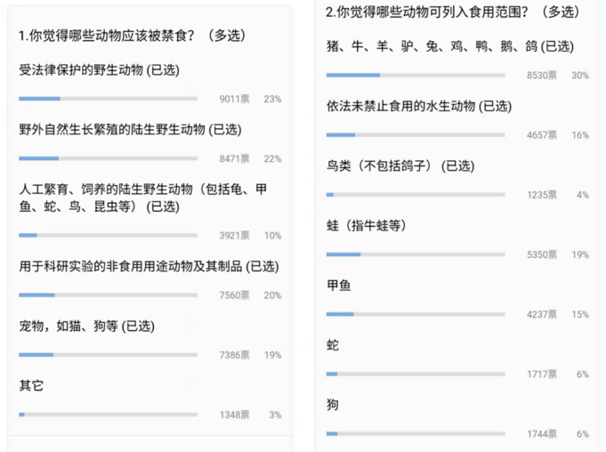 網(wǎng)友投出9011票,贊成“受法律保護(hù)的野生動物”應(yīng)該被禁食,占比23%;另有8471票,22%的網(wǎng)友支持禁食“野外自然生長繁殖的陸生野生動物”。對于“用于科研實(shí)驗(yàn)的非食用用途動物及其制品”選項(xiàng),有20%的網(wǎng)友(7560票)支持禁食。禁食的投票選項(xiàng)中,還有19%的網(wǎng)友贊成禁食貓狗等寵物(7386票),10%的網(wǎng)友贊成禁食包括龜、甲魚、蛇、鳥、昆蟲等人工繁育、飼養(yǎng)的陸生野生動物,票數(shù)為3921票。