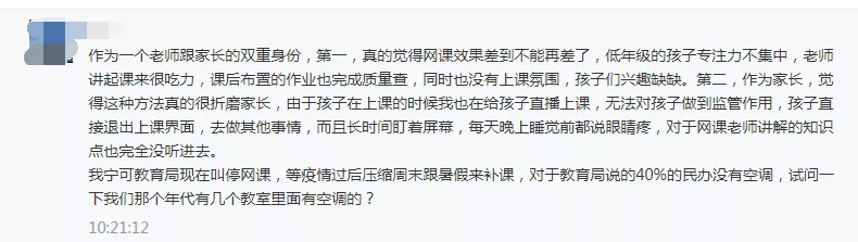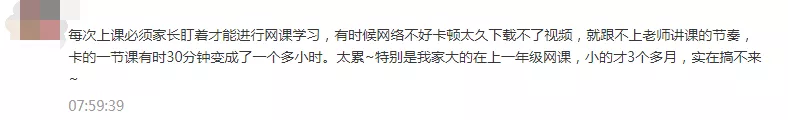 有家長表示,如果遇上網(wǎng)絡(luò)卡頓,很容易跟不上老師講課的節(jié)奏。還有家長表示曾出現(xiàn)過因?yàn)榫W(wǎng)絡(luò)太卡,有時候設(shè)備剛弄好,課程就已經(jīng)結(jié)束了的情況。