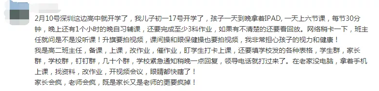 許多家長(zhǎng)對(duì)孩子視力十分擔(dān)憂。持該意見(jiàn)的家長(zhǎng)認(rèn)為,目前網(wǎng)課使孩子使用電子設(shè)備時(shí)間過(guò)長(zhǎng),對(duì)孩子視力造成不小影響。一位高二班主任老師也表示,不僅學(xué)生的視力受到影響,老師也要每天長(zhǎng)時(shí)間面對(duì)著手機(jī)和電腦,眼睛的健康難以保證。