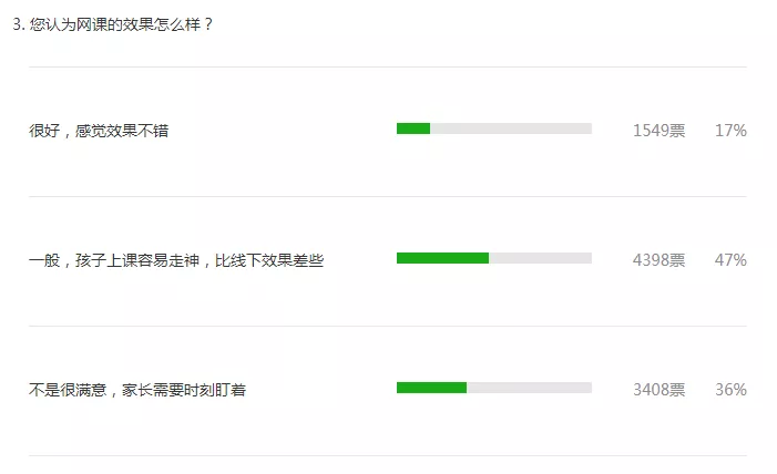 網(wǎng)課的效果到底如何?根據(jù)深圳新聞網(wǎng)的調(diào)查,64%的參與者對網(wǎng)課效果感到“滿意”或“一般”。多數(shù)參與者認為“孩子容易走神”或“需要家長時刻監(jiān)管”。在低年級孩子“難以集中注意力”這一問題在留言里尤為突顯。