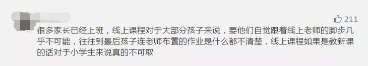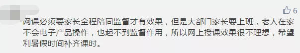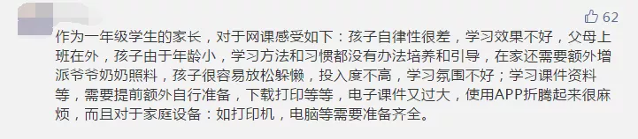 雖然網(wǎng)課兩端是老師和學(xué)生,但家長的參與也必不可少。部分參與者認(rèn)為,如果沒有家長的有效監(jiān)管,網(wǎng)課很難保證教學(xué)質(zhì)量,而大部分家長已經(jīng)復(fù)工,無法時刻盯著孩子。有些家長晚上下班后還要監(jiān)督孩子上網(wǎng)課、做作業(yè),實在“費時、費力、費神”。讓孩子自己上網(wǎng)課,有些“連作業(yè)是什么都不清楚”。還有些孩子利用上網(wǎng)課的空檔玩游戲,甚至“從十七號開始到現(xiàn)在玩游戲超過1萬塊”。
