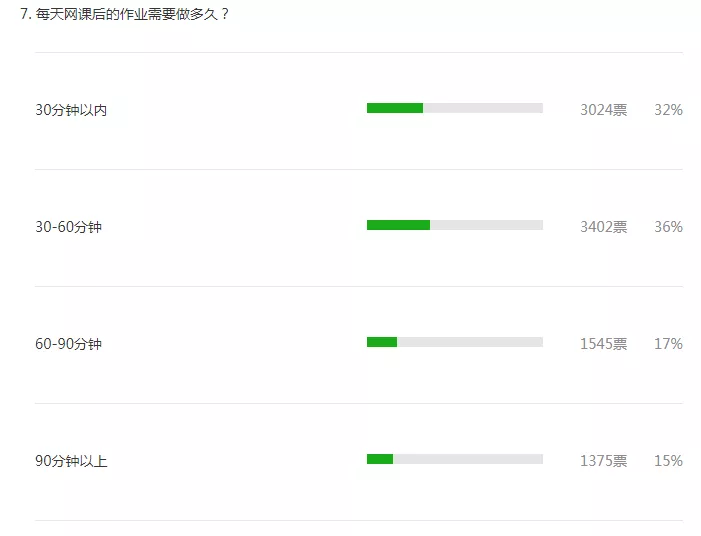 根據(jù)投票結(jié)果,68%的人認(rèn)為網(wǎng)課后的作業(yè)在60分鐘內(nèi)可以完成。不過,許多參與者認(rèn)為網(wǎng)課后的作業(yè)對于家長來說負(fù)擔(dān)較重。
