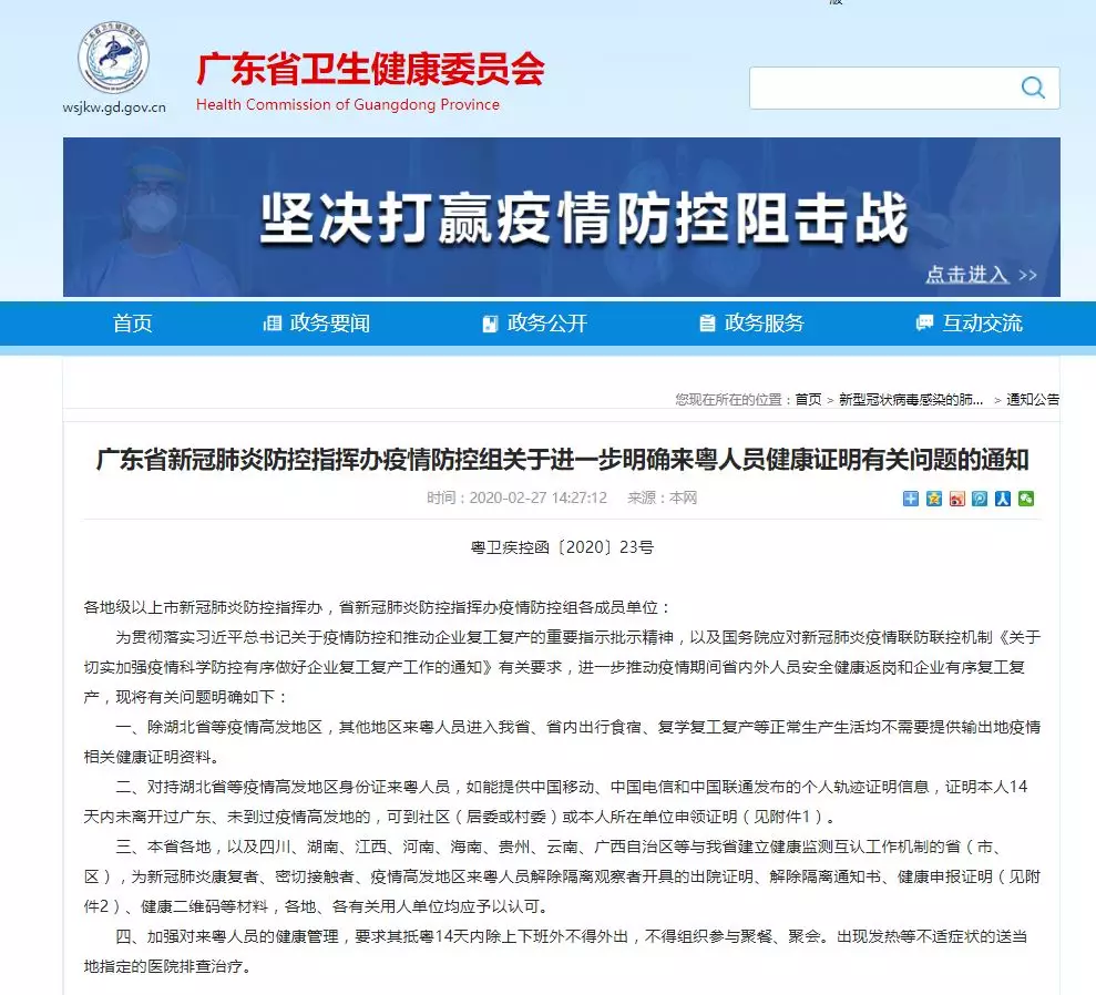 廣東省新冠肺炎防控指揮辦疫情防控組關(guān)于進(jìn)一步明確來(lái)粵人員健康證明有關(guān)問(wèn)題的通知