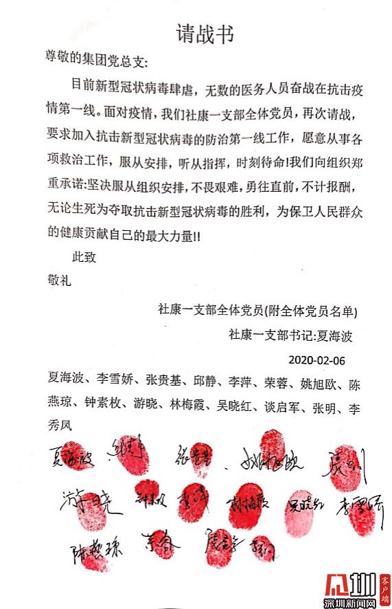 見圳客戶端·深圳新聞網(wǎng)訊(記者 董非)“讓黨旗在防控斗爭第一線高高飄揚?!毙鹿诜窝滓咔榘l(fā)生以來,南山區(qū)醫(yī)療集團總部黨員勇當先鋒,以實際行動踐行初心使命,涌現(xiàn)出眾多感人故事,展現(xiàn)了共產(chǎn)黨員的風采與擔當。 疫情發(fā)生后,南山區(qū)第一時間制定出臺了《黨建引領(lǐng)疫情防控工作五項行動方案》,南山區(qū)委書記王強號召全體黨員,發(fā)揮黨組織的戰(zhàn)斗堡壘作用和黨員的先鋒模范作用,全力保障人民群眾生命安全和身體健康,讓黨旗在防控疫情斗爭第一線高高飄揚,堅決打贏疫情防控人民戰(zhàn)爭、總體戰(zhàn)、阻擊戰(zhàn)。南山區(qū)醫(yī)療集團總部積極響應(yīng),黨建引領(lǐng)下的防控抗疫工作有序科學地展開。 今年1月底,深圳市南山區(qū)區(qū)委授旗成立南山醫(yī)療系統(tǒng)黨員突擊隊。南山區(qū)醫(yī)療集團總部緊急組建了防控新冠肺炎應(yīng)急突擊隊,僅一天內(nèi)區(qū)醫(yī)療集團就共有169人完成第一批應(yīng)急突擊隊報名,其中黨員過半數(shù)。 疾風知勁草,烈火煉真金。一封封請戰(zhàn)書閃電匯聚到黨總支,召即來,來能戰(zhàn),戰(zhàn)能勝,沖鋒在前就是擔當?shù)淖蠲姥堇[;一位位黨員迅速入隊黨員突擊隊,他們重溫入黨誓言,在黨旗下實踐著醫(yī)者仁心、人間大愛;一份份入黨申請書紛沓而來,特殊時期經(jīng)受特殊考驗,一批優(yōu)秀的醫(yī)護人員頁主動向黨組織靠攏。鏗鏘的語言、堅定的決心、舍我的擔當,是南山區(qū)醫(yī)療集團總部廣大黨員逆行而上、抗擊疫情的堅定決心和必勝信心。 最美逆行黨支部,積極請戰(zhàn)敢擔當 “我是共產(chǎn)黨員,我請戰(zhàn)!愿為戰(zhàn)勝疫情全力以赴!”這是南山區(qū)醫(yī)療集團總部一支部13名黨員和2名入黨積極分子聯(lián)名撰寫的《請戰(zhàn)書》(節(jié)選)。 面對新冠肺炎疫情,一支部黨員在夏海波支部書記夏海波的帶領(lǐng)下,在發(fā)熱門診、發(fā)熱患者預(yù)檢分診、社區(qū)“三位一體”排查等工作中,積極發(fā)揮共產(chǎn)黨員戰(zhàn)斗在一線、沖鋒在一線的模范帶頭作用,為戰(zhàn)勝新冠肺炎疫情全體黨員積極主動請戰(zhàn),并向集團黨總支遞交了請戰(zhàn)書。 社康一支部全體黨員的請戰(zhàn)書 一個個紅手印,令人淚目,彰顯著南山區(qū)醫(yī)療集團總部白衣天使們逆行而上的使命擔當和責任意識。 一支部書記夏海波說,“成為疫情防控工作第一線發(fā)展黨員,是面對疫情充分發(fā)揮黨員先鋒作用的具體實踐。此次請戰(zhàn),將更加激勵他們我們在今后的工作特別是近期防疫防控工作中,以黨員的標準嚴格要求自己,發(fā)揮黨員先鋒模范作用。同時,也會對全院全體員工產(chǎn)生積極引領(lǐng)、鼓舞作用,以更飽滿的斗志投入防疫防控工作?!?/p> 老黨員重溫入黨誓詞,面對黨旗表決心 “我宣誓:我志愿加入中國共產(chǎn)黨……”這是一次特別的宣誓。接到組織號召后,社康二支部的老黨員鐘達宏和吳麗娉,對著黨旗,以重溫入黨誓詞的方式,不忘黨員初心,牢記使命,積極沖鋒在前,誓要打贏防控狙擊戰(zhàn)。 社康二支部的老黨員鐘達宏和吳麗娉,對著黨旗,重溫入黨誓詞,誓要打贏防控狙擊戰(zhàn) 面對來勢洶洶的疫情,南山區(qū)醫(yī)療集團總部的黨組織和黨員干部不但沒有被嚇倒,反而激起了他們昂揚的戰(zhàn)斗意志和飽滿的工作熱情。 “我宣誓,我自愿加入抗擊新型冠狀病毒肺炎疫情防控工作隊伍,責任上肩,聽黨指揮,服從命令,科學應(yīng)對,恪盡職守,努力守護轄區(qū)居民健康,堅決打贏疫情防控攻堅戰(zhàn)!”守土有責、守土擔責、守土盡責,所有社康中心的黨員干部將筑牢抗疫的基層防線,誓要守護轄區(qū)居民的生命健康。 社康二支部黨員在黨旗下宣誓努力守護轄區(qū)居民健康 艱難時刻主動請戰(zhàn),夫妻雙雙奮戰(zhàn)一線 1月26日,南山區(qū)醫(yī)療集團總部下發(fā)關(guān)于組建防控新型冠狀病毒感染肺炎應(yīng)急突擊隊報名的通知。除了得到集團黨員們的積極響應(yīng)之外,各個支部涌現(xiàn)出一波遞交入黨申請書的小高潮。 李婧是社康支部的一名全科醫(yī)生,一直在社康醫(yī)院中心從事全科醫(yī)療工作,戰(zhàn)“疫”的號角吹響,李婧第一時間參戰(zhàn),在所有抗疫時期入黨人員里第一個遞交了手寫入黨申請書。 李婧醫(yī)生的手寫入黨申請書 起初,她所在的蔚藍海岸社康中心考慮到李婧的愛人是深圳市公立醫(yī)院急診科醫(yī)生其愛人是深圳市某公立醫(yī)院的急診科醫(yī)生,疫情發(fā)生以來一直堅守在崗位上,家中尚有1歲零3個月的寶寶,就沒有讓她參加社區(qū)“三位一體”排查和酒店留守值班等一線工作和醫(yī)學觀察點留守值班等一線工作。李婧得知后,她主動提交請戰(zhàn)書、舍小家顧大家,并沒有因為生活上的困難而有所退縮,主動要求參與疫情排查一線工作。李婧夫妻還制定了家庭的“交接班”制度,一個去上白班,另一個就上夜班。 執(zhí)行三位一體排查工作前,李婧醫(yī)生與民警、社區(qū)工作者開會準備 在南山醫(yī)療集團第六黨支部書記蔡偉山給她的入黨介紹信中這樣寫道:李婧和她的愛人都雙雙忙碌在疫情一線李婧和她的愛人都雙雙忙碌在疫情防控一線,她這種顧全大局的無私奉獻精神,這份執(zhí)著和堅定的職業(y