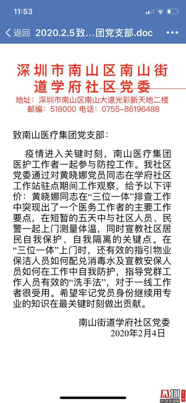 在學(xué)府社區(qū)工作站駐點(diǎn)期間,黃曉娜用專業(yè)知識(shí)在控制疫情最關(guān)鍵時(shí)刻,為社區(qū)居民做出貢獻(xiàn),并收到了南山區(qū)南山街道學(xué)府社區(qū)黨委的感激表揚(yáng)。