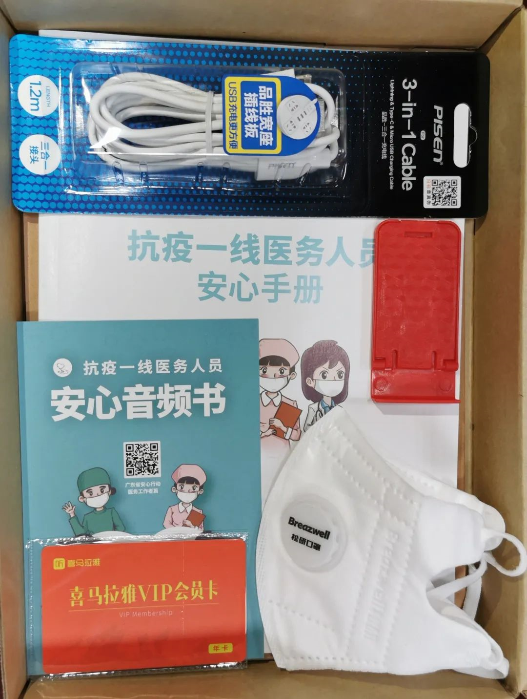 這是一個20x28cm2的普通牛皮紙紙盒,里面最顯眼的,是一本《安心手冊》,一張“抗疫一線醫(yī)務人員安心音頻書”卡,一張音頻APP的有聲書卡,和兩個N95口罩。此外,筆記本、筆、手機充電線、手機支架,也都細心地配全了。紙盒旁還放著一個小巧玲瓏的智能聲控音箱,使用者“不沾手”就能使用,防止病毒傳播。小東西里,也藏著大關愛。