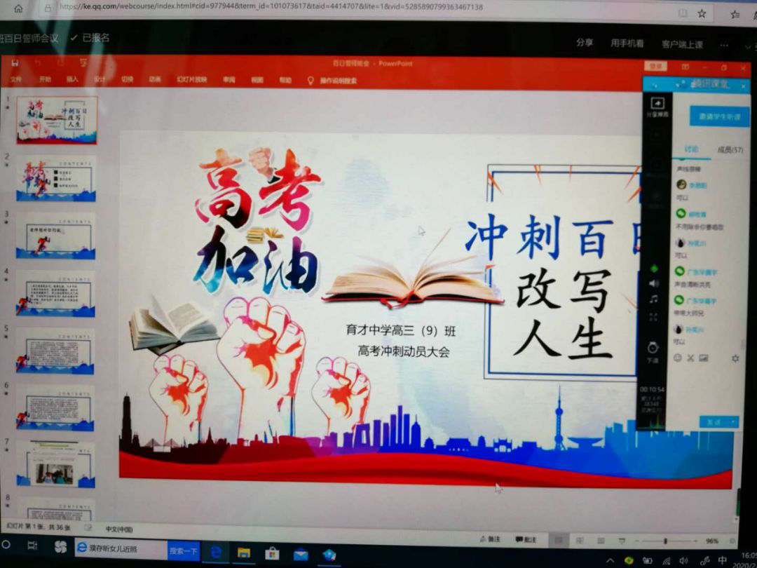 2月28日,橫崗高級(jí)中學(xué)2020屆高三全體師生利用騰訊課堂召開(kāi)以班級(jí)為單位的網(wǎng)上“高考百日誓師大會(huì)”。各班精心制作PPT,提前錄制老師、家長(zhǎng)、同學(xué)的祝福小視頻,科任老師、學(xué)生家長(zhǎng)、學(xué)生代表連麥鼓勵(lì),同學(xué)們最后對(duì)著電子屏幕高喊百日誓詞同時(shí)下定決心,為自己的夢(mèng)想,刻苦拼搏,永不言悔。網(wǎng)上“百日誓師”豪情滿(mǎn)懷、溫情涌動(dòng)、感人至深。