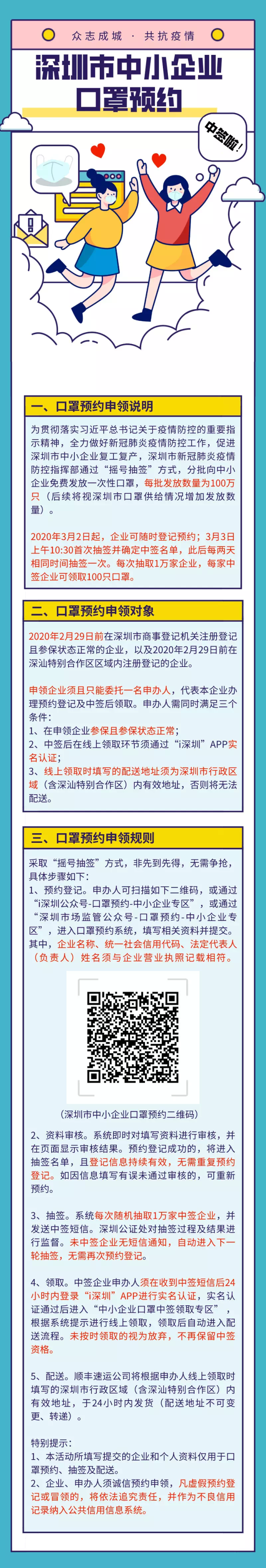 南方網(wǎng)2020年3月6日訊 好消息!深圳市中小企業(yè)可以預(yù)約申領(lǐng)口罩啦!2020年2月29日前在深圳市深汕特別合作區(qū)區(qū)域內(nèi)注冊登記的企業(yè),均可以預(yù)約申領(lǐng)!配送地址必須是深圳市行政區(qū)域(含深汕特別合作區(qū)),免費(fèi)包郵哦!