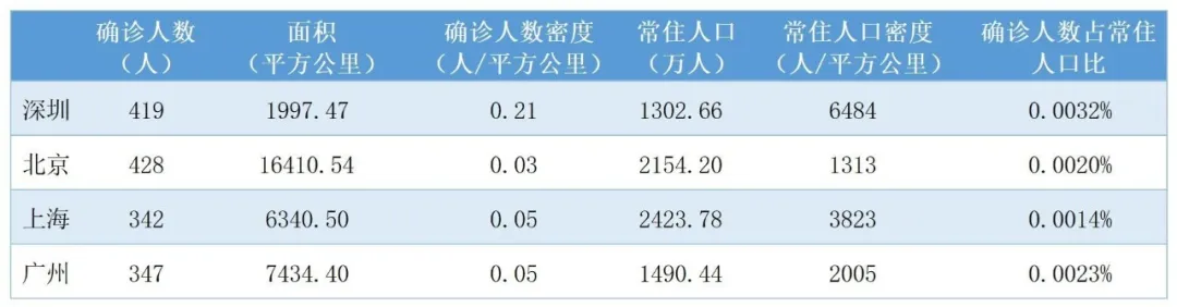 ▲深圳常住人口密度大,人員流動頻繁,疫情防控難度高,導致確診人數(shù)在北、上、廣、深四大城市中最多,分布密度位也居首位,對防控工作形成巨大壓力。
