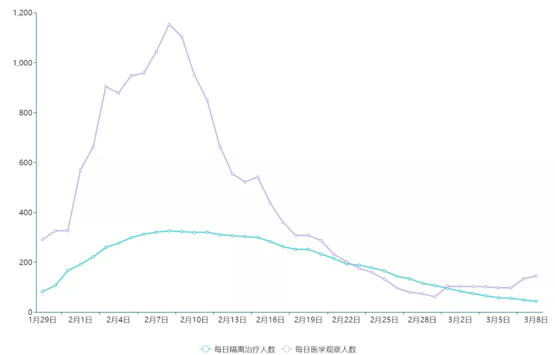 ▲2月7日起,每日新增確診病例數(shù)保持在較低水平。2月18日至3月5日,深圳僅新增兩例(均為境外輸入型病例)。這一方面是由于國內(nèi)疫情發(fā)生地采取封閉措施后,輸入型病例不斷減少;另一方面基層疫情防控工作取得較好成效,病毒本地傳播被有效阻斷。