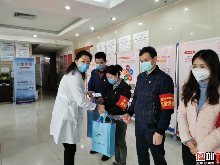 桃源街道總工會主席陳娜(左一)為防疫一線工作人員送上防疫物資